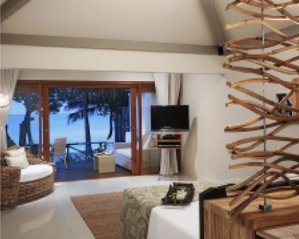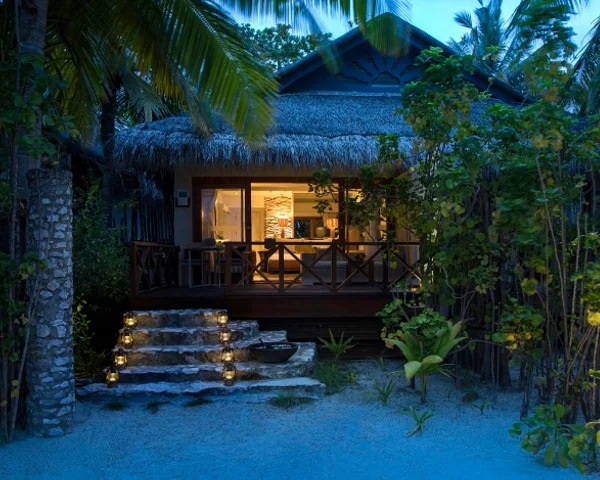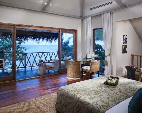 The resort offers thatched-roof villas, including both overwater and beachfront options, each designed to provide an intimate and eco-conscious experience amidst vibrant coral reefs and pristine beaches.