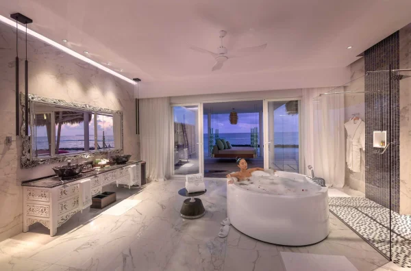 The resort features spacious villas, including both beach and overwater options, complemented by a range of dining venues, a Balinese-inspired spa, and various recreational activities, all within a sustainable, all-inclusive framework.