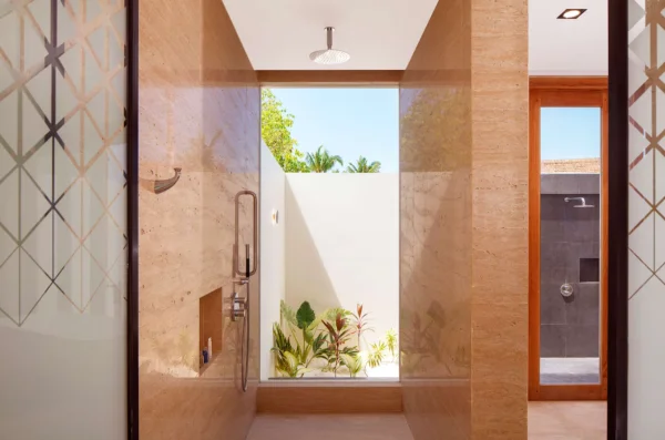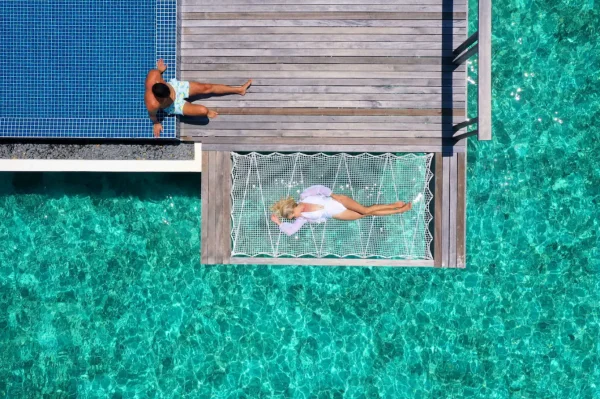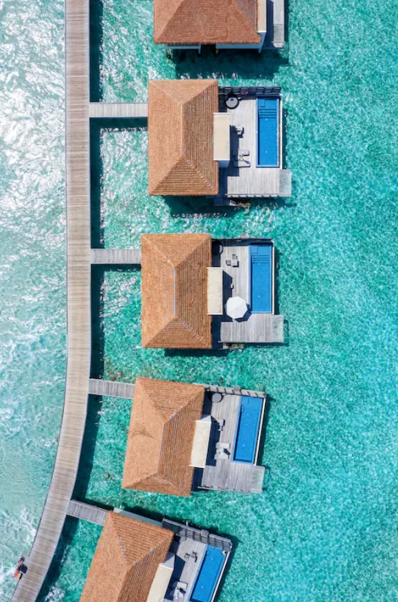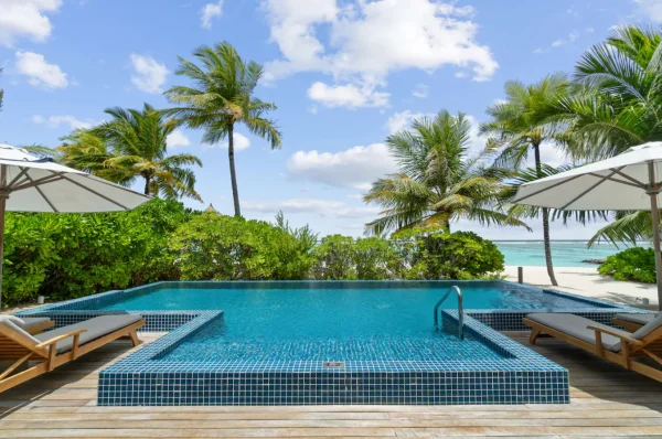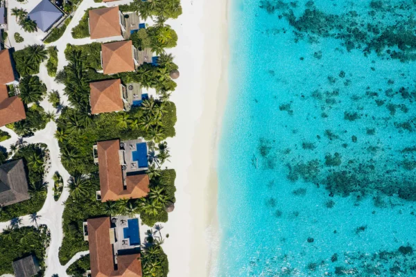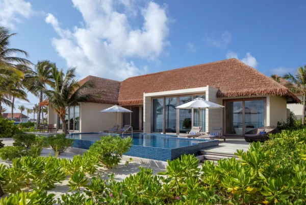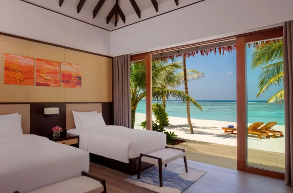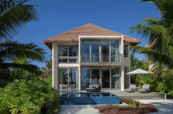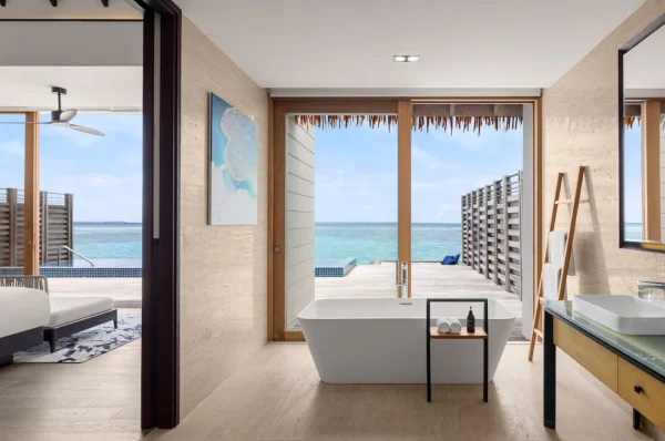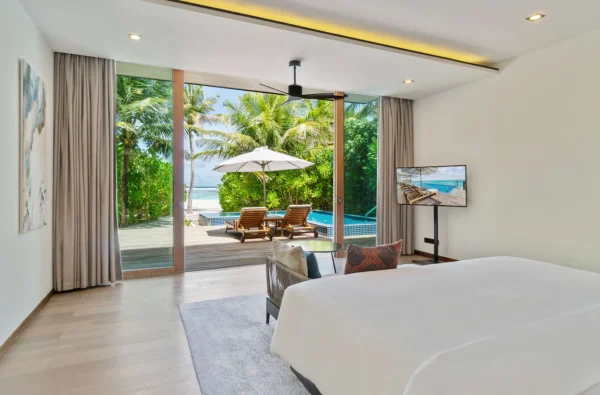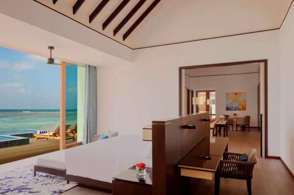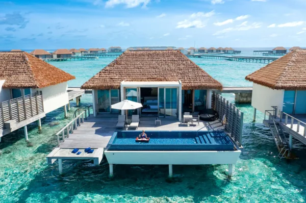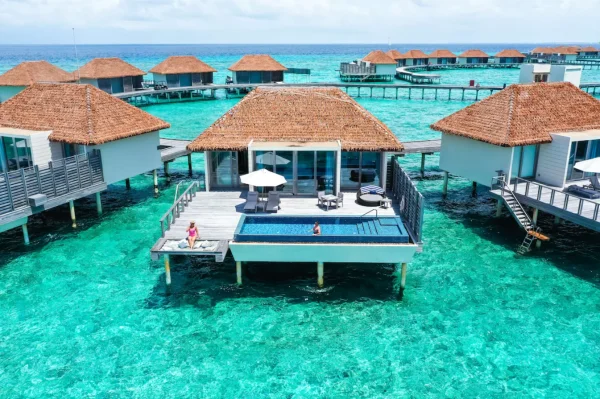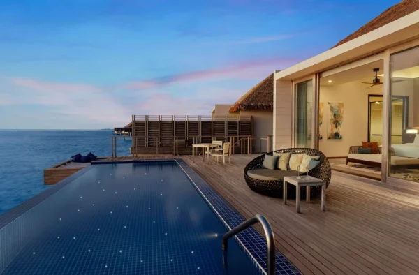 The resort features spacious beachfront and overwater villas, each equipped with private pools, and provides guests with diverse dining options, a PADI-certified dive center, and opportunities for year-round whale shark encounters.