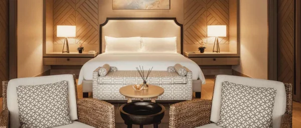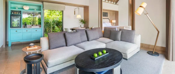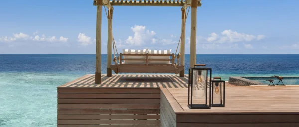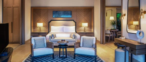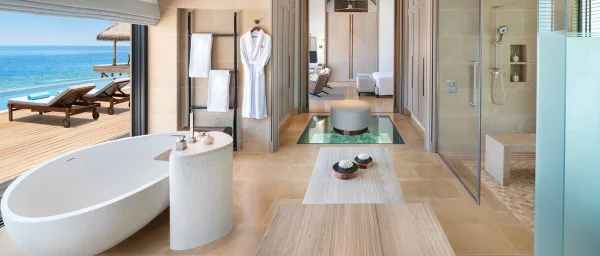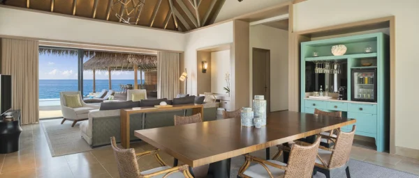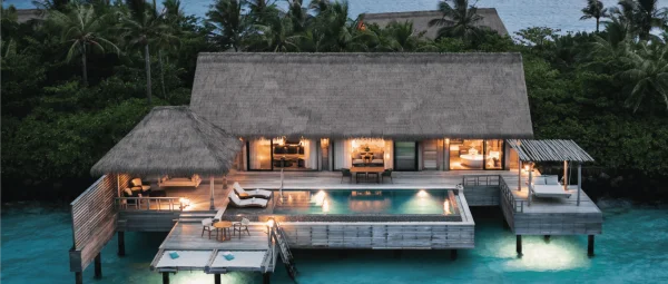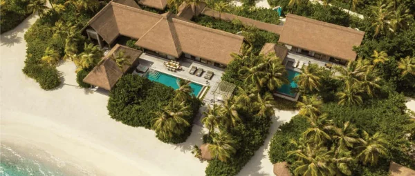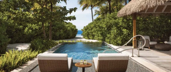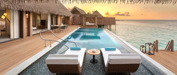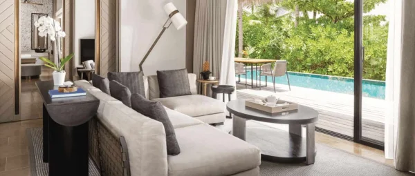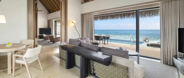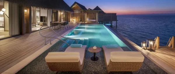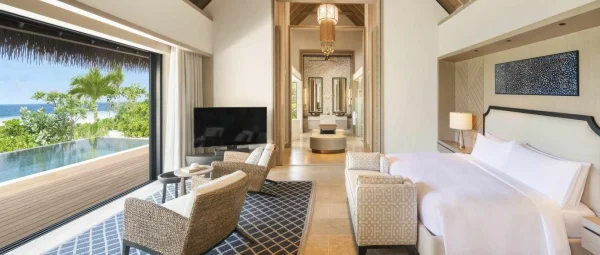 Waldorf Astoria Maldives Ithaafushi is a luxurious resort spanning three private islands in the Kaafu Atoll, offering all-pool villas with expansive indoor and outdoor spaces.