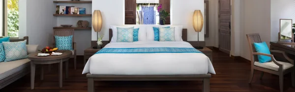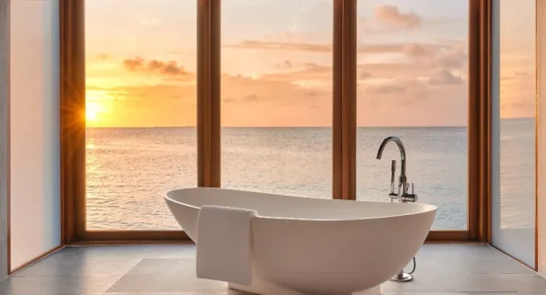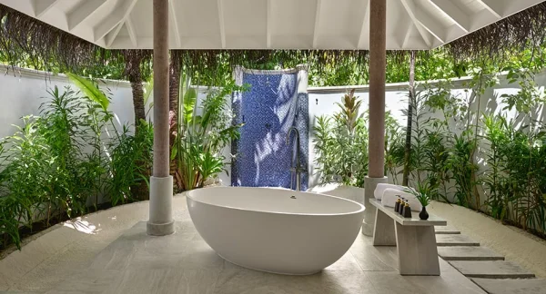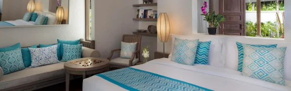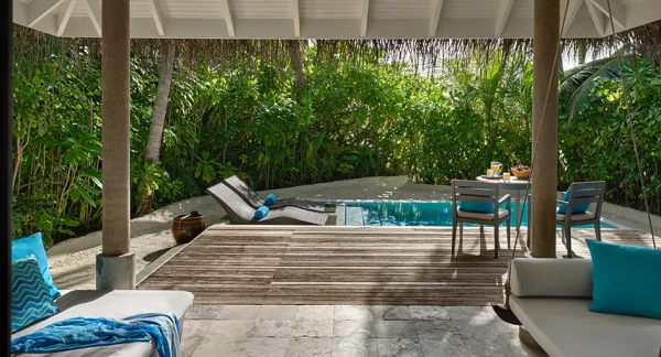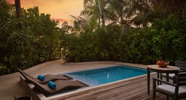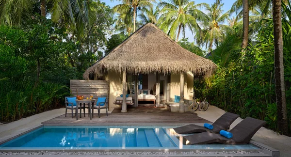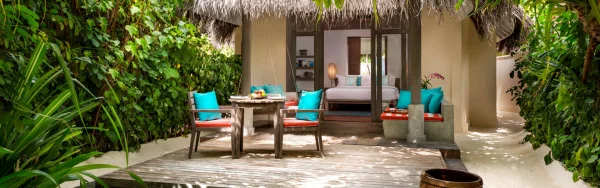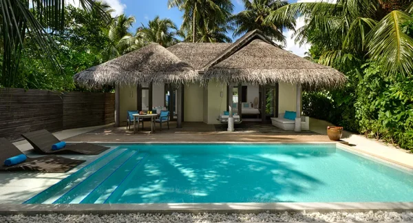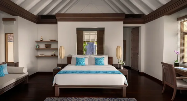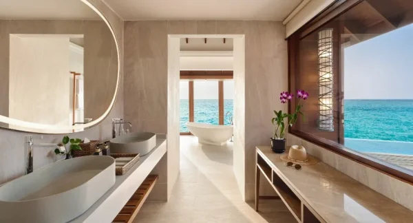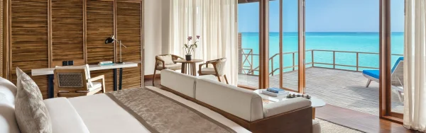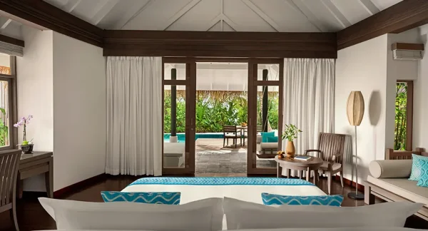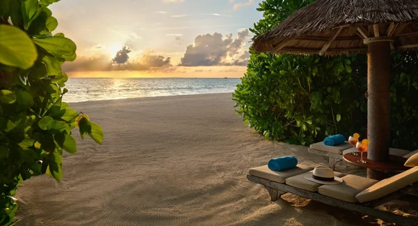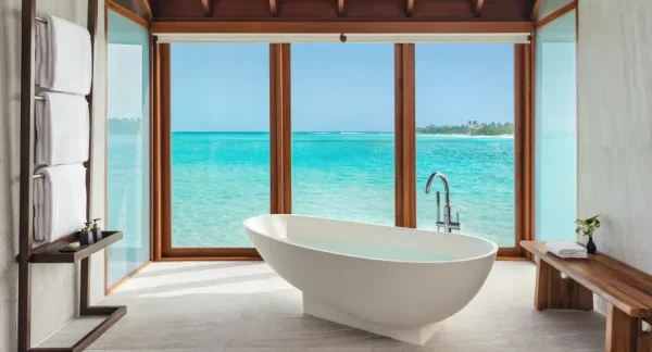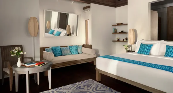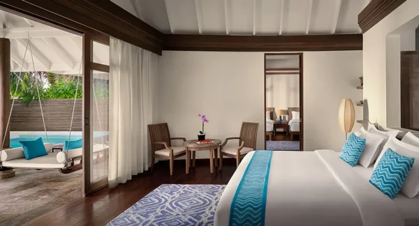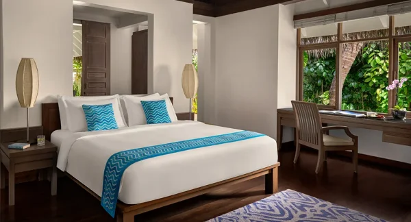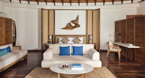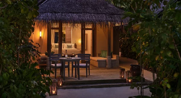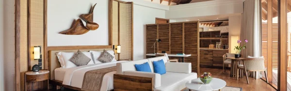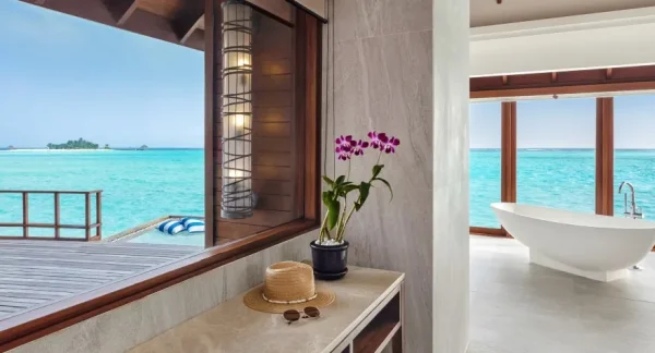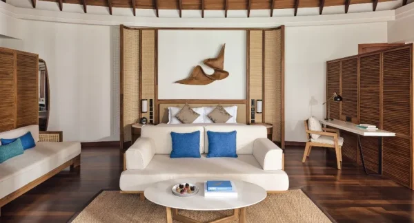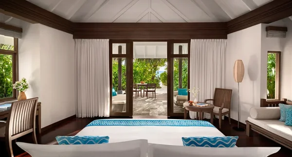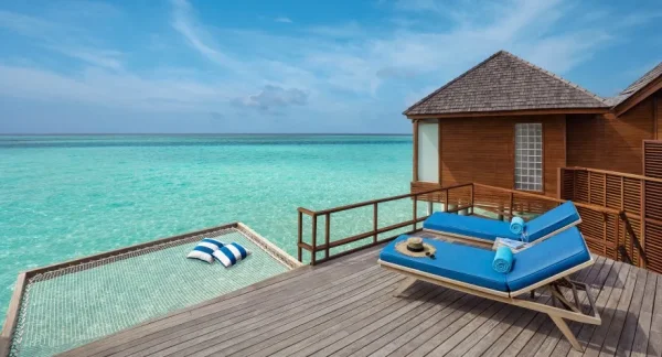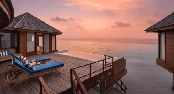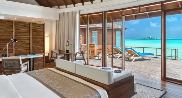 Anantara Dhigu Maldives Resort features spacious beach and overwater villas, some with private pools, along with family-friendly amenities and an overwater spa. Guests can enjoy multiple dining options, water sports, surfing, snorkeling, and easy access to nearby sister resorts.