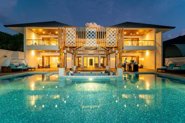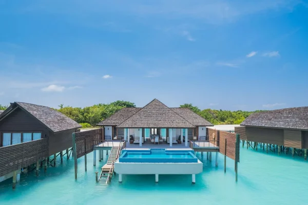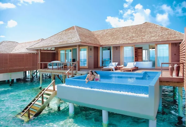 Hideaway features luxurious beach and overwater villas with private pools, a spa, multiple dining options, and a vibrant house reef for snorkeling and water sports.