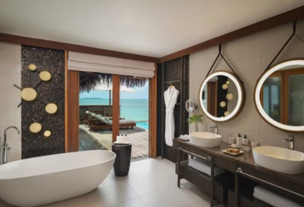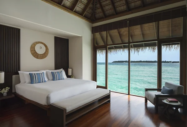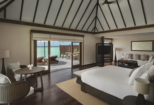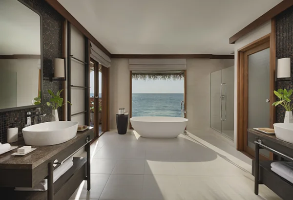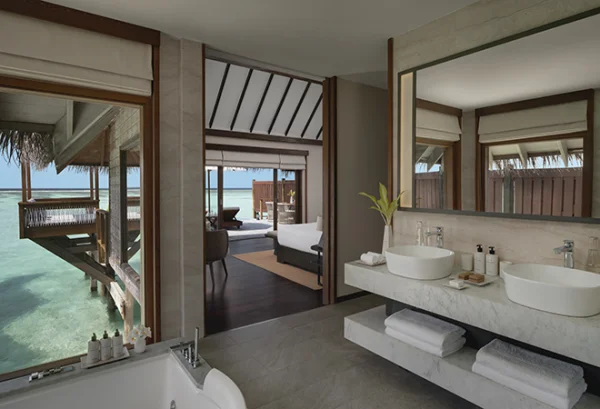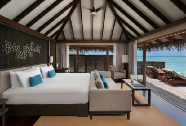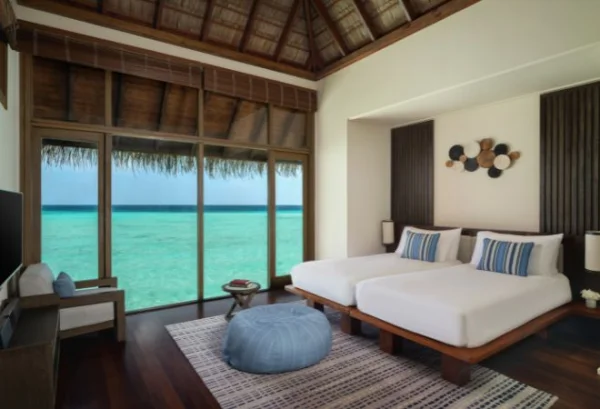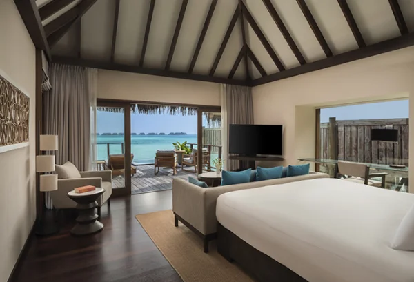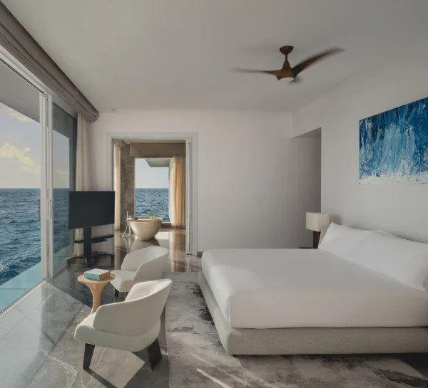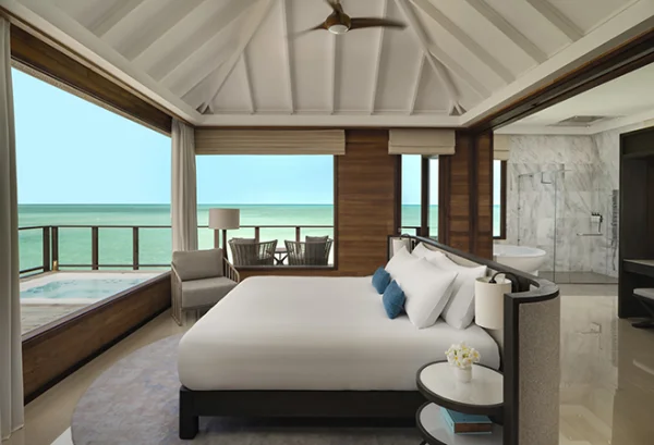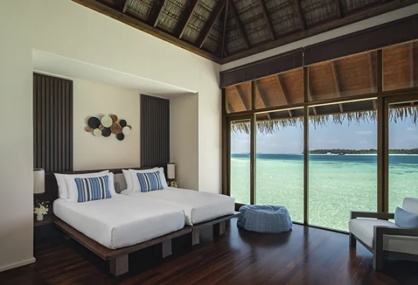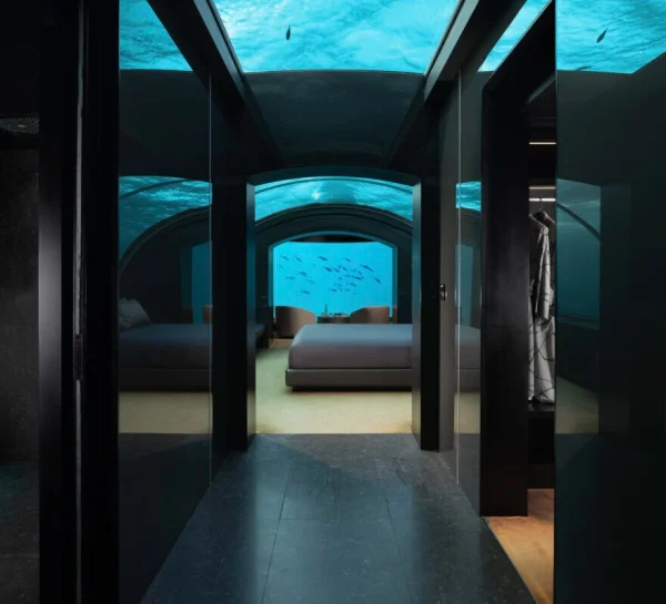 Conrad Maldives Rangali Island features beach and overwater villas, including the iconic underwater residence The Muraka, along with multiple gourmet dining venues and a luxury spa. Guests can enjoy snorkeling, diving, water sports, and exceptional marine experiences across two private islands.