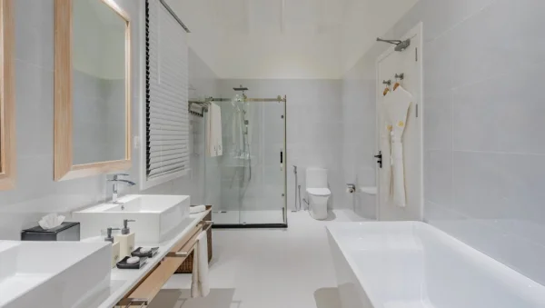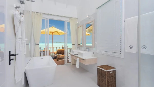 Beachfront and water villas, multiple dining options, water sports, diving, spa, wellness center, kids club, and outdoor tennis court.