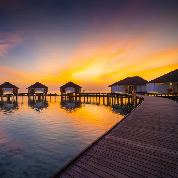 The resort offers beachfront and overwater bungalows, a vibrant house reef, dining, a spa, and water activities in a tropical setting.