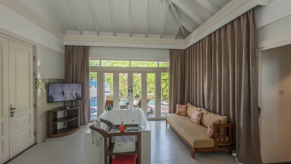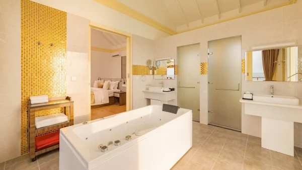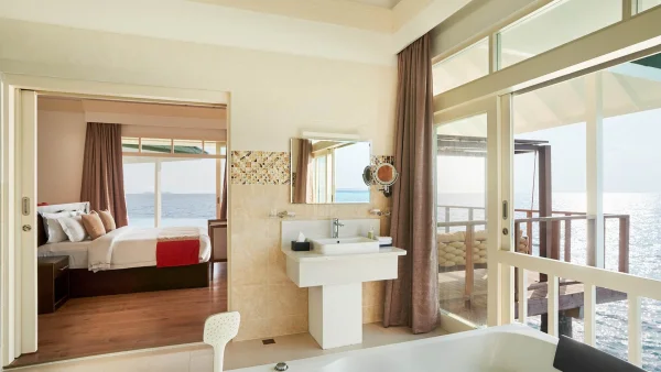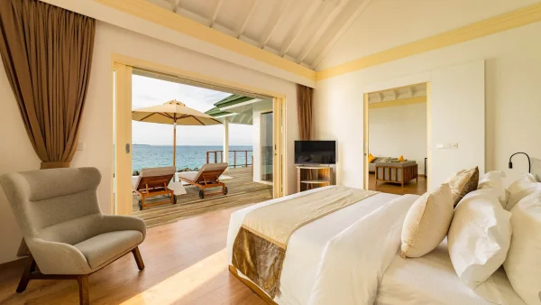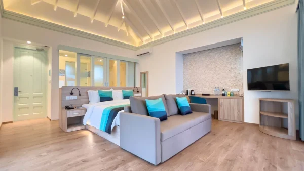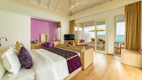 Guests can enjoy luxurious accommodations, including overwater villas with slides, indulge in 24/7 dining at multiple restaurants, and partake in activities such as the Maldives' largest floating water park, jungle go-kart racing, and horseback riding along the beach.